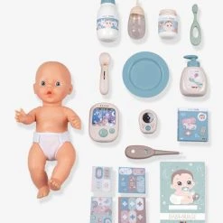 - De nombreux accessoires sont inclus pour agrémenter les fonctions de jeu : 1 caméra factice, 1 baby phone électronique avec plusieurs sons de berceuses, 1 biberon, 1 assiette, 1 couche, 1 flacon pousse-mousse, 1 bouteille de lait, 1 brosse à dents,  1 thermomètre mécanique, 1 petit pot et 1 cuillère avec de la nourriture factice, 1 boite de pansements et des planches de pansements et 1 poupon.