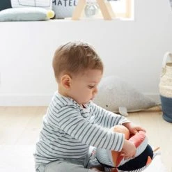Une jolie balle facile Ă manier, que bĂ©bĂ© pourra observer, toucher, mordiller et qui l’aidera Ă dĂ©velopper sa prĂ©hension. Les diffĂ©rentes couleurs, matières et textures favoriseront l’Ă©veil de la vue et du toucher tandis que la petite clochette Ă l’intĂ©rieur de la balle stimulera l’ouĂŻe !