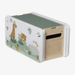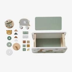 - Coffre comprenant 4 jouets d’éveil : – Pour le renard – un jeu de cubes, une pyramide, un renard à roulettes et un boulier à fils. – Pour Tanzanie – un jeu de cubes, une pyramide tigre, un éléphant à roulettes et un boulier à fils