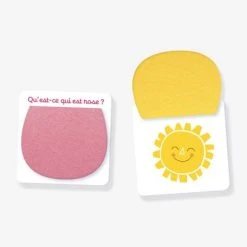 - 9 grandes cartes (10 x 10 cm)Â en carton solide avec chacune un volet en feutrine