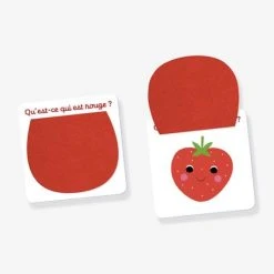 Qu’est ce qui est rouge ? Un soleil ou une fraise ? La réponse est cachée sous la feutrine d’une des 9 cartes du Cache-cache couleurs NATHAN ! A votre petit de jouer, de différencier les couleurs, de manipuler les cartes, de s’initier au langage dans un univers familier pour lui !