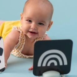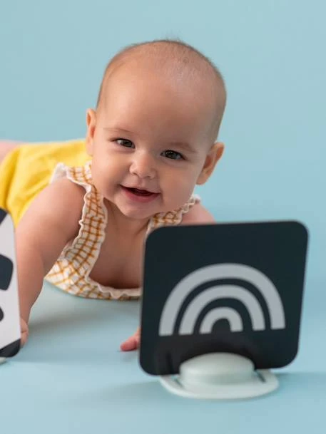 – Phase 2 – 3m+ : au verso, les cartes colorĂ©es et le miroir permettent Ă bĂ©bĂ© de dĂ©velopper sa perception visuelle.