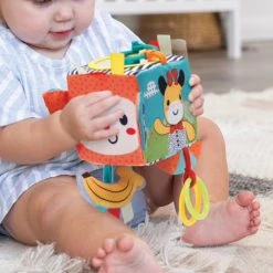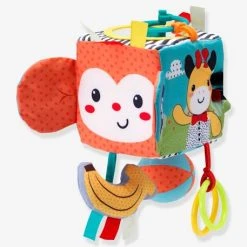 BĂ©bĂ© s’amusera beaucoup en dĂ©couvrant ce qui se cache sous les oreilles des animaux qui ornent ce joli cube en textile multicolore. DotĂ© de sons de papier froissĂ© et d’un grand miroir, bĂ©bĂ© n’est pas au bout de ses dĂ©couvertes. Il pourra s’amuser Ă nourrir le singe avec la petite banane ou lancer la balle Ă l’Ă©lĂ©phant. Le cube dispose de petits anneaux colorĂ©s faciles Ă attraper pour bĂ©bĂ©. DotĂ© d’un anneau amovible, le cube d’activitĂ©s sera de tous les voyages.