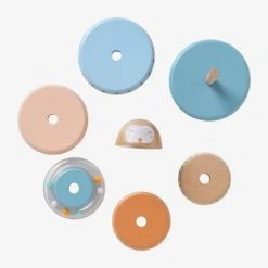 - 6 niveaux : 1 cercle bleu ciel en bois avec dessins, 1 cercle en bois uni de couleur rosée, 1 anneau transparent avec billes de couleurs + petit cercle en bois à glisser à l’intérieur, 1 cercle en bois orange avec imprimé petits points blancs, 1 cercle couleur bois avec imprimé , 1 embout en bois arrondi pour fermer le culbuto avec imprimé tête de hibou