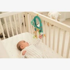 Enfin, deux petits compagnons pendus au miroir amuseront bébé avec leur rubans de couleurs et leurs petits anneaux que bébé tentera de saisir.