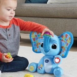 Un éléphant animé qui joue à coucou caché et reconnaît les fruits ! Ses oreilles animées promettent des parties de coucou caché ! Grâce à sa trompe magique animée, l’éléphant peut reconnaître les 5 fruits et permet à l’enfant d’apprendre les chiffres, les couleurs, les fruits, leurs goûts et leurs textures. En appuyant sur le coeur lumineux, l’enfant découvre des anecdotes et des phrases amusantes. Un autre bouton déclenche des bruits d’animaux de la nature. 3 modes de jeu différents qui promettent des heures d’amusement à bébé et de jolies découvertes !