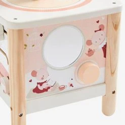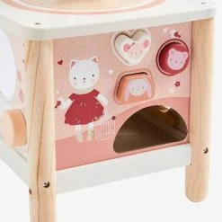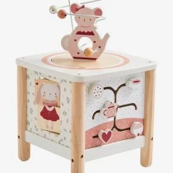 Un cube d’activités en bois qui ne manque pas d’idées pour éveiller et émerveiller bébé ! 5 faces plus intrigantes les unes que les autres, avec sur le haut du cube, un boulier en forme de théière souris qui peut se retourner pour fermer la boite. Sur les 4 faces : une face labyrinthe, une face miroir, une face avec 3 formes à encastrer et une face avec 2 images à reconstituer ! Ce grand cube d’activités promet de jolies découvertes à votre bébé !