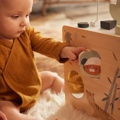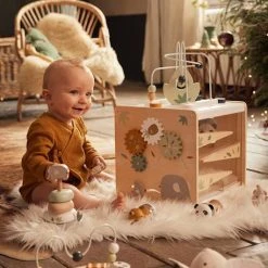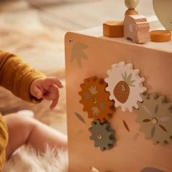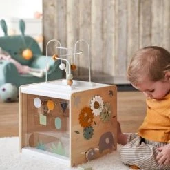 Un joli cube d’activité doté de faces en plexiglas qui offrent de jolies surprises ! Grâce à ce cube, l’enfant pourra faire de multiples découvertes : faire glisser les billes sur le boulier, actionner les engrenages, faire dévaler les palets sur le toboggan… et bien d’autres activités pour stimuler ses sens !