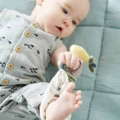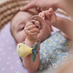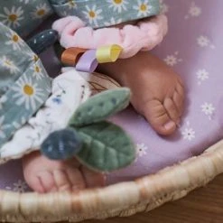 - 1 hochet pied rose avec yeux, joues brodées et feuilles en volume + 1 hochet pied imprimé fleur avec cigale à grelot et feuilles en volume
