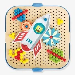 - Ce coffret comprend six rouages, six fonds en carton, sept décorations en carton, 100 épingles colorées et une boîte avec couvercle en bois.