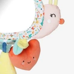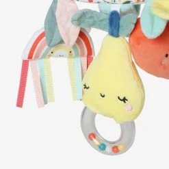 - 3 jouets attachés : 1 arc en ciel en volume avec grelot et rubans volants, 1 poire en velours avec broderies + anneau transparent avec billes de couleurs, 1 coeur en velours avec broderies et clochette