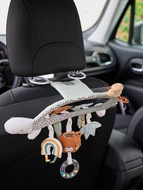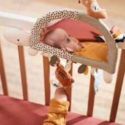 - 3 jouets attachés par anneaux : arc-en-ciel avec clochette + feuille + tête tigre avec anneau transparent à billes de couleurs