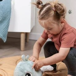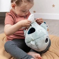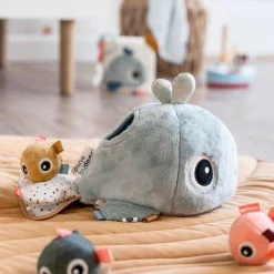 Craquez pour cette adorable baleine Wally, accompagnĂ©e de ses petits amis poissons ! La joyeuse baleine aime jouer Ă cache-cache. DĂ©couvrez comment les petits poissons se cachent Ă l’intĂ©rieur de Wally. Chaque poisson Ă©met un son diffĂ©rent : une clochette, un bruit de papier et un carillon encourageront les petits Ă ramper derrière eux. Laissez votre petit bout dĂ©couvrir les petits poissons, les diffĂ©rentes textures de la baleine ainsi que le miroir cachĂ© sur sa nageoire. Les Ă©tiquettes colorĂ©es et le jet d’eau seront Ă©galement de belles surprises ! Ce jouet d’Ă©veil va bien amuser les petits tout en dĂ©veloppant leur concentration et leur coordination Ĺ“il-main.Â