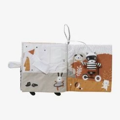 - 1 livre + 1 peluche raton attaché par lien en tissu au livre pour le déplacer page par page