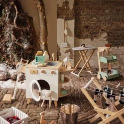 Les enfants aiment tellement imiter les grands ! Avec cette super machine à laver et à repasser, ils vont être comblés ! Toute équipée, la machine possède 3 tablettes, un évier, un hublot qui s’ouvre, un compartiment à lessive et de petits boutons pour la programmation. Elle est également livrée avec un fer à repasser, un bidon de lessive et un adorable panier à linge. Un magnifique jouet en bois qui amuse et décore à la fois !