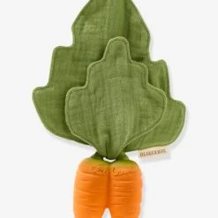 Les fruits et légumes d’Oli&Carol sont maintenant transformés en Mini Doudou pour que les tout-petits se sentent à l’aise partout où ils vont ! 2 en 1 : c’est à la fois un doudou et un anneau de dentition ! Les 2 petites carottes Cathy en caoutchouc 100 % naturel forment le jouet de dentition. Le doudou en coton biologique représente les feuilles. Les deux parties sont amovibles ce qui permet de les laver séparément. Cathy est un mini doudou ergonomique facile à attraper, que bébé va adorer câliner et mâchouiller.