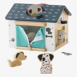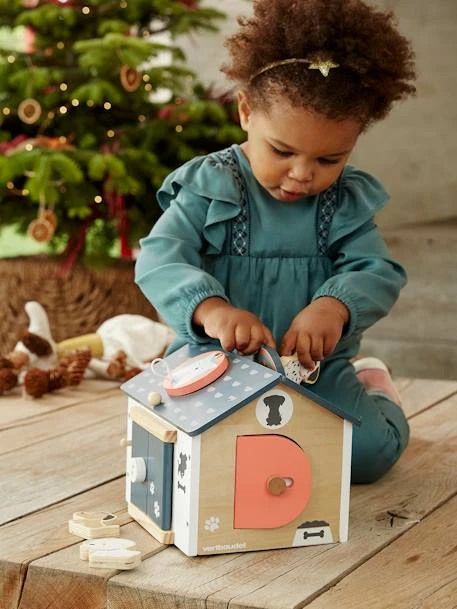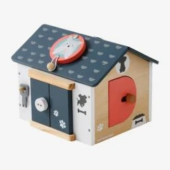 Une niche avec 6 ouvertures que l’enfant devra ouvrir pour ensuite y insĂ©rer un petit chien. Chaque ouverture propose un système diffĂ©rent : ouverture Ă pousser, Ă tirer, Ă boutonner, Ă clĂ©… de quoi dĂ©velopper leur motricitĂ© fine en s’amusant !