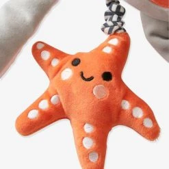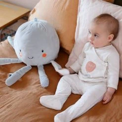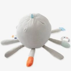 Une jolie pieuvre qui accompagnera bébé tout en douceur pour l’éveiller et l’émerveiller ! Sur les pattes, elle possède plusieurs éléments qui amuseront les petits. Différentes matières, textures et d’adorables petits jouets à manipuler (anneau de dentition, étoile vibrante, anneau à billes…).