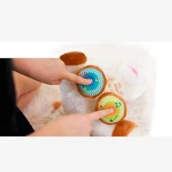 Cette peluche sensorielle et musicale permettra à toute la famille de jouer avec bébé en se tenant les mains et en maintenant les capteurs de chaque côté !