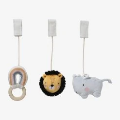 - Livré avec 3 jouets d’éveil en tissu : un lion avec billes, un rhinocéros pouet pouet et un arc-en-ciel avec anneau en bois