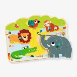 Baobab est un puzzle d’encastrement sonore en bois sur le thème de la savane. Coco, Houhouhou, Ough, Croc, Grrr ! L’enfant remet chaque animal Ă sa place pour dĂ©couvrir son cri.  Il va adorer faire et dĂ©faire ce puzzle et pourquoi pas imiter les cris de l’Ă©lĂ©phant, du singe ou du perroquet ! Cette activitĂ© calme est un moyen ludique de le familiariser Ă la reconnaissance des formes, des couleurs et des sons autour des animaux de la savane.