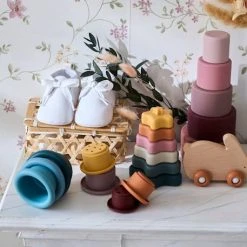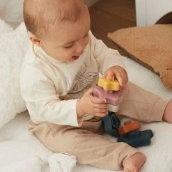 Parmi les étapes du développement de la motricité de bébé, l’empilage nécessite beaucoup de dextérité ! Grâce à cette pyramide d’étoiles en silicone, l’enfant s’exerce à enfiler chaque étoile de la plus grande à la plus petite. Un jouet en silicone dans l’air du temps, qui plait également pour ses jolies couleurs.
