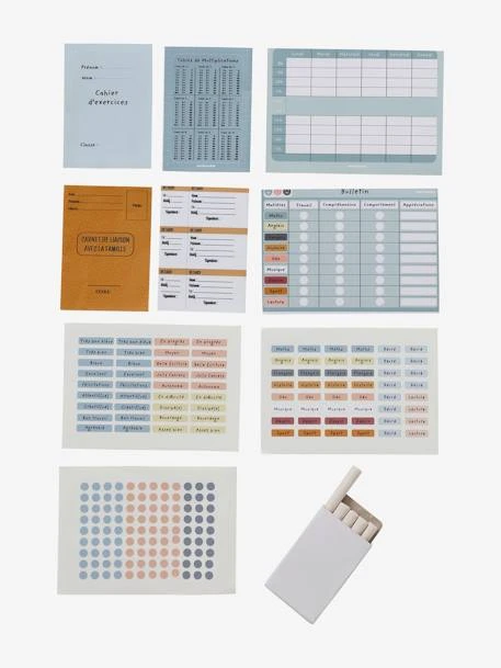 - Papeterie : cahier d’exercices avec tables de multiplications au dos, carnet de liaison, bulletin, emploi du temps. 3 planches de stickers avec pastilles colorĂ©es, matières et apprĂ©ciations pour remplir l’emploi du temps et le bulletinÂ