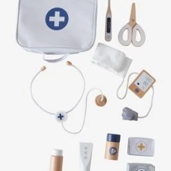 - Contient : 1 mallette en tissu, crèmes, coton tiges, thermomètre, tensiomètre, stéthoscope, bandage, pansements, ciseaux.