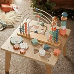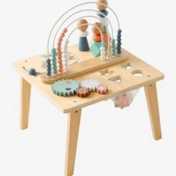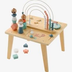 Les petits seront fascinés de faire tant de découvertes sur cette superbe table d’activités ! Sur la table, différents jeux d’éveil : un boulier, un jeu des engrenages, des formes à encastrer (avec un filet sous la table), un chemin de petites perles et des personnages à empiler… Votre enfant va pouvoir s’éveiller en beauté !