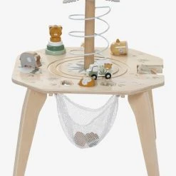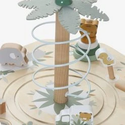 - Palmier boulier et toboggan à balle, camion de safari qui tourne autour du palmier, encastrement avec des formes ou la boule à marteler, éléphant à visser, pyramide tigre, perroquet à faire voler avec l’oiseau marteau, rangement pour la boule ou le marteau, méli-mélo des félins, buisson