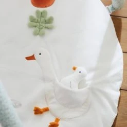 - Jouets sur le tapis : feuilles et trèfle à 4 feuilles en volumes, marguerite avec pétales en volume, 1 oie avec ailes en forme de poche pour accueillir son oisillon, 1 poule avec 1 aile volante pour poussin en velours, lien avec 3 anneaux en plastique coloré, 1 pomme avec un miroir caché