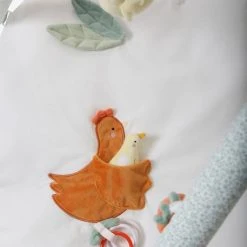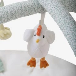 - Jouets sur les arches :Â un anneau transparent avec billes de couleurs, 1 poussin avec ailes volantes et anneau + feuilles en volume, 1 poule avec ailes volantes, 1 pomme avec pouet et 1 fraise avec broderies