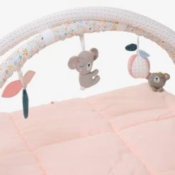 - Jouets sur le tapis :Â miroir + petit livre avec pages crisp + anneau dentition avec feuille velours + anneau transparent avec billes couleurs + petite tĂŞte koala en velours avec lien vibrant + broderie fleurs