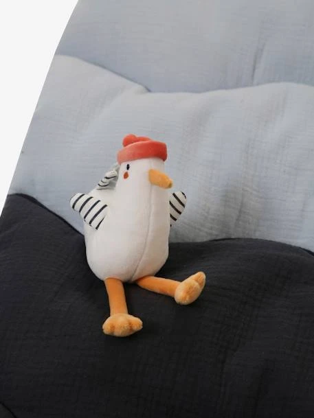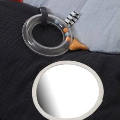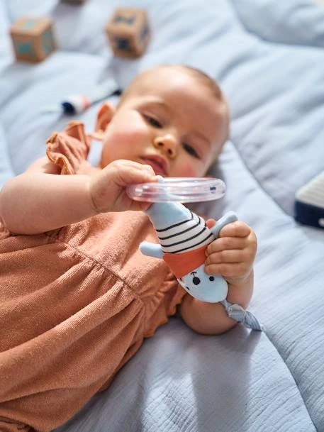 - Jouets attachés au tapis : phoque avec lien en velours et coton, poisson attaché avec lien sur tapis en velours et coton avec pouet pouet, mouette en velours et coton avec clochette, 3 anneaux plastiques de couleurs, 1 anneau transparent avec billes de couleurs, drapeaux et rubans en velours, miroir, bouchon attaché par lien en coton et velours