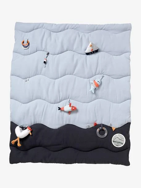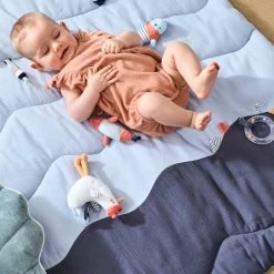 BĂ©bĂ© vogue vers de tendres dĂ©couvertes avec ce tapis d’Ă©veil en gaze de coton ! Il dispose de plusieurs jouets qui stimuleront les sens des petits : poisson pouet pouet, mouette Ă clochette, anneaux Ă billes… c’est parti pour de nouvelles aventures !