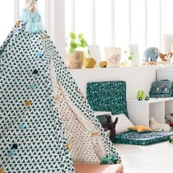Pour leur permettre de vivre pleinement leur rĂŞves de petits sioux, voici un chouette tipi rĂ©versible Ă “planter” dans la chambre ! Une face aux motifs triangles, une face parsemĂ©e de petites Ă©toiles, Ă eux de choisir le dĂ©cor qu’ils souhaitent ! Et pour la petite touche finale, le tipi est livrĂ© avec deux jolies guirlandes Ă pompons ! Que l’aventure commence !