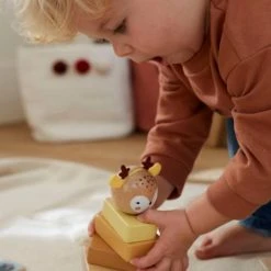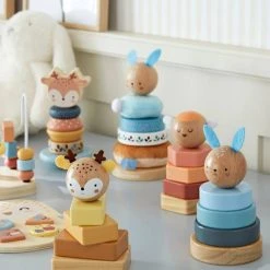 3 tours colorées à empiler pour le plus grand plaisir des tout petits ! Un lapin bleu, une abeille jaune et une biche rouge qui demanderont réflexion et dextérité à votre petit explorateur !