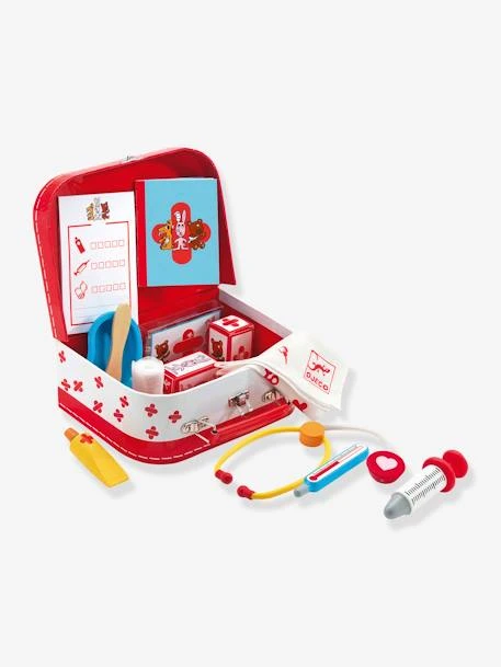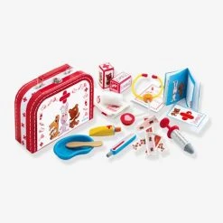 - Contient : 1 mallette en carton, 1 seringue en bois, 1 thermomètre en bois, 1 spatule en bois, 1 stĂ©thoscope en bois et plastique, 1 bassine en plastique, 1 tube de crème, 6 pansements Ă©lastiques en tissus, 2 bandes blanches et 1 tapis en tissu, 1 carnet d’ordonnance et 1 carnet de santĂ©.